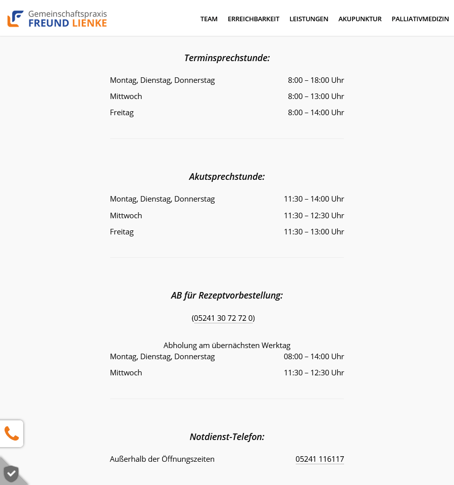 Für die Gemeinschaftspraxis Freund Lienke aus Gütersloh haben wir die technische Umsetzung und Betreuung der Praxiswebseite übernommen. Die Seite entstand im Zuge der Neueröffnung der Praxis und sollte Patienten schnell und übersichtlich über das Angebot der Praxis informieren.