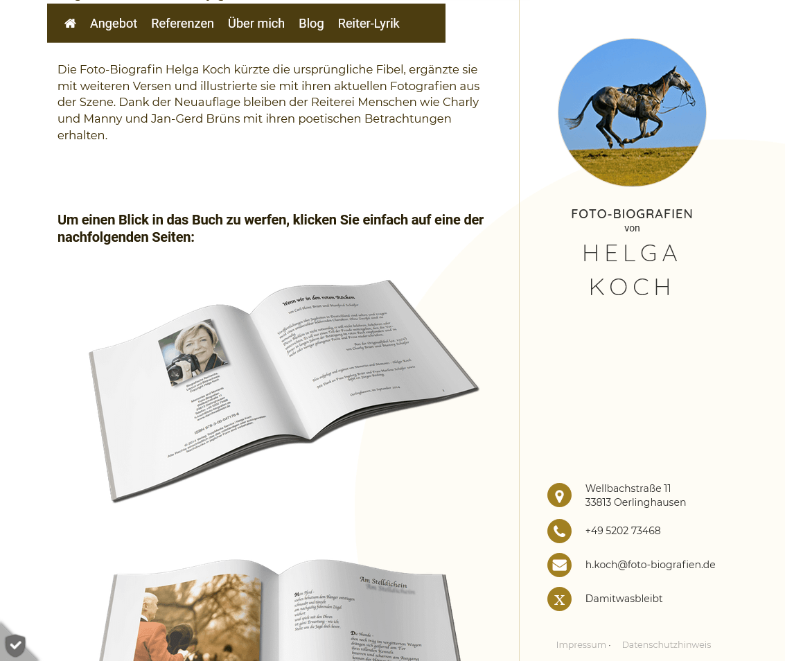 Die Webseite stellt das Konzept der Fotobiografie vor und erklärt, wie aus Gesprächen, Fotos und Erinnerungen ein individuelles Buch entsteht. Interessierte erhalten so einen klaren Überblick über das Angebot und den Ablauf der Erstellung.