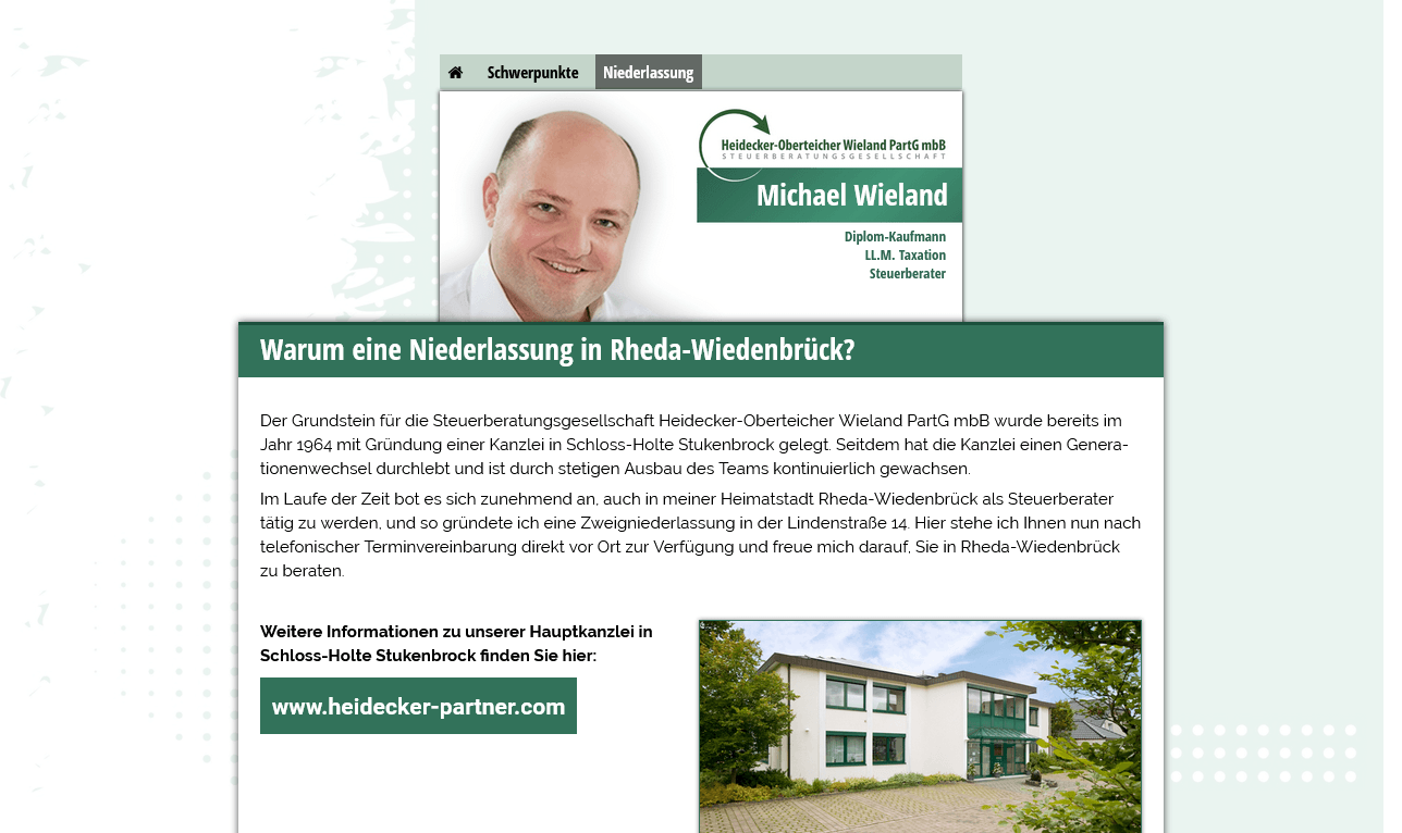 Diese Web-Visitenkarte ergänzt den Hauptauftritt der Steuerberatungskanzlei und informiert über die Zweigniederlassung in Rheda-Wiedenbrück. Die Seite stellt die steuerlichen Schwerpunkte vor und bietet alle wichtigen Kontaktmöglichkeiten für Mandanten vor Ort.