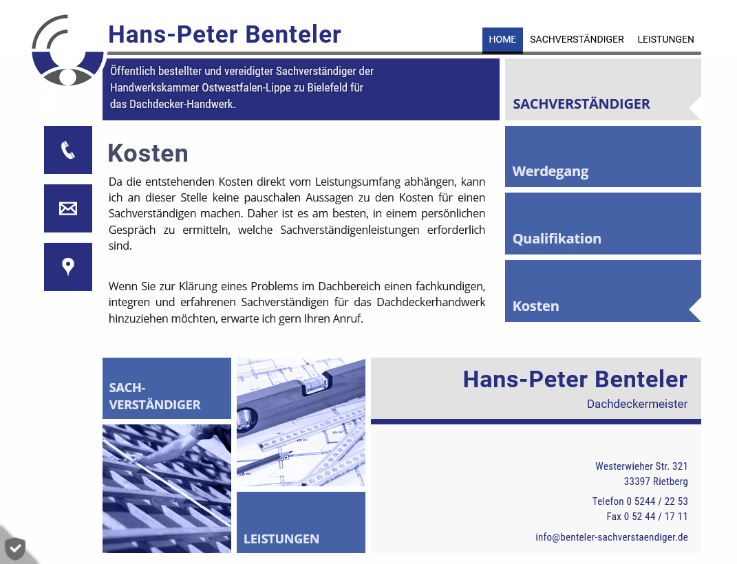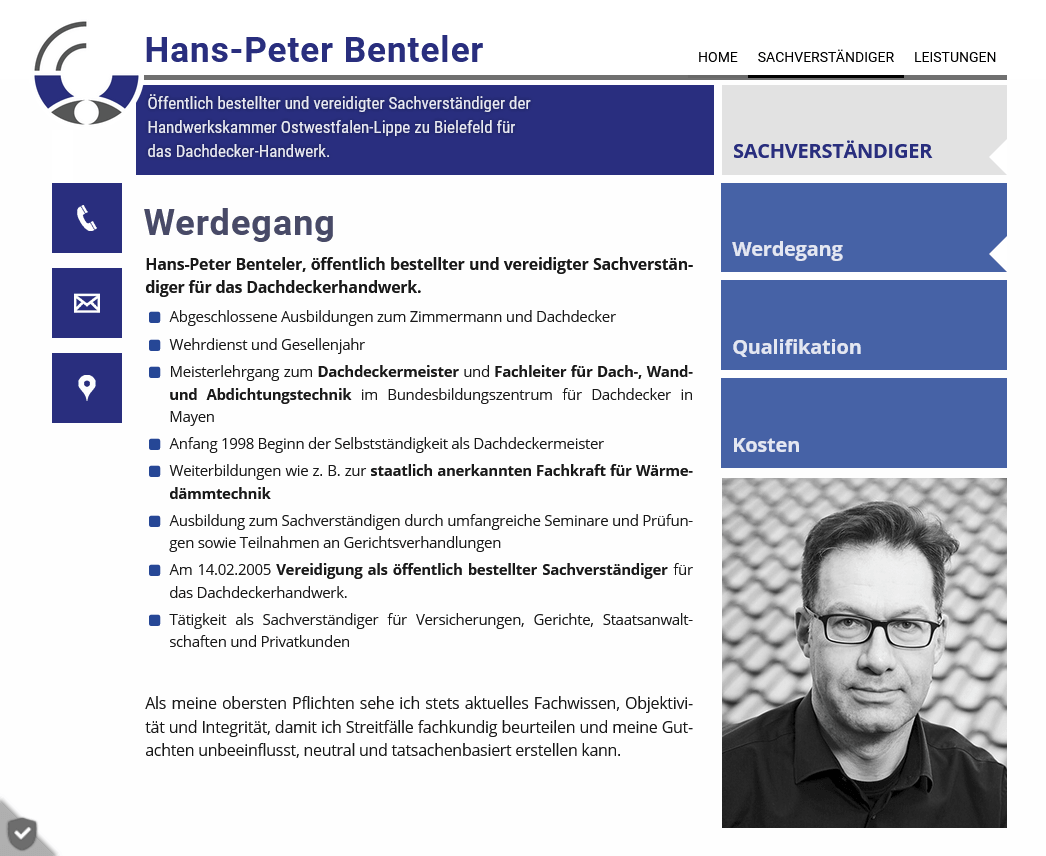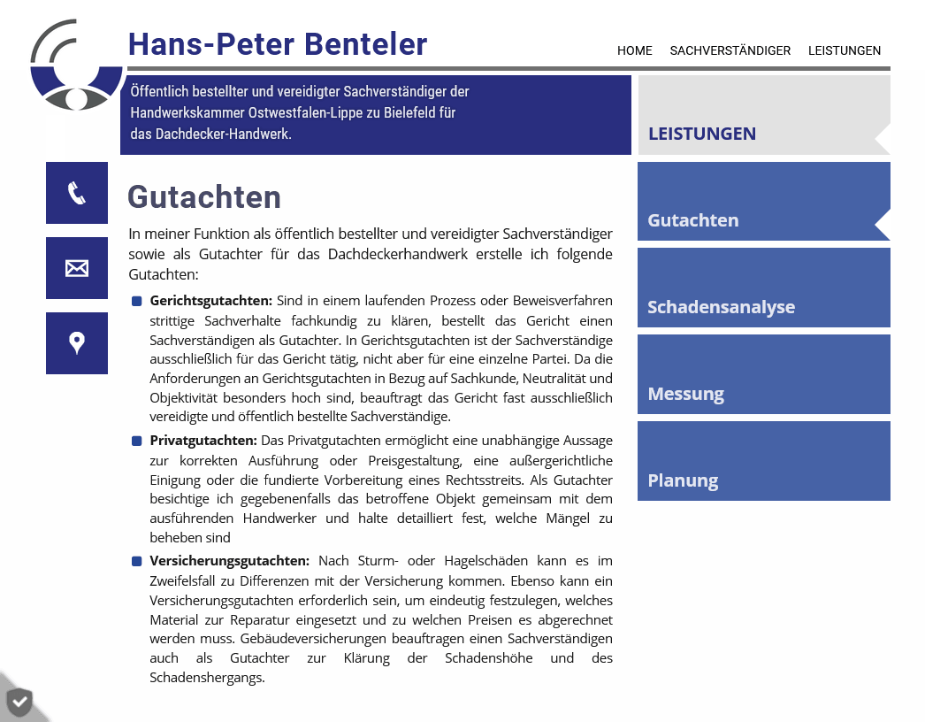 Die Webseite vermittelt Seriosität und Fachkompetenz und richtet sich sowohl an private Bauherren als auch an Unternehmen oder Versicherungen, die eine fachliche Bewertung von Bauschäden benötigen.