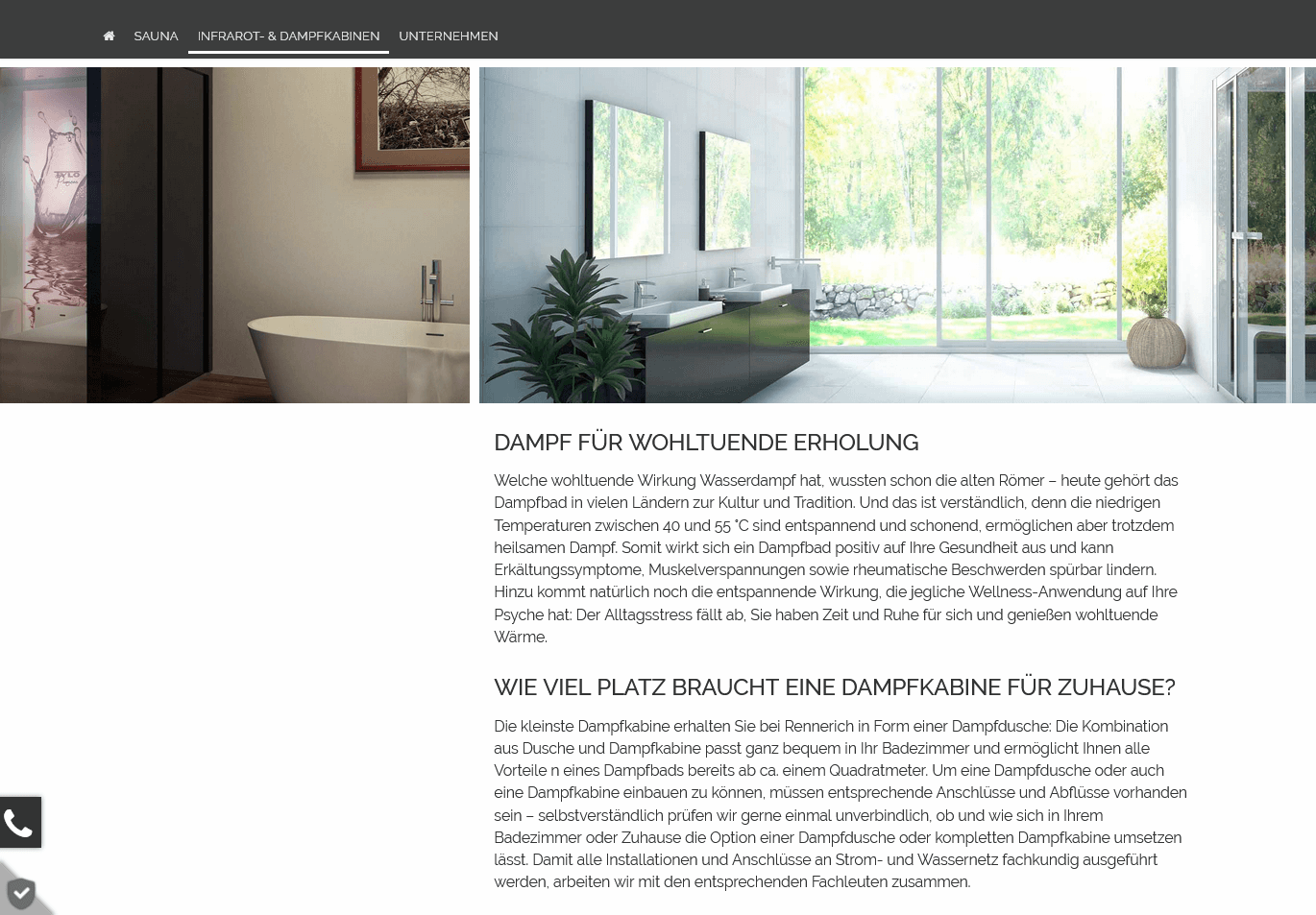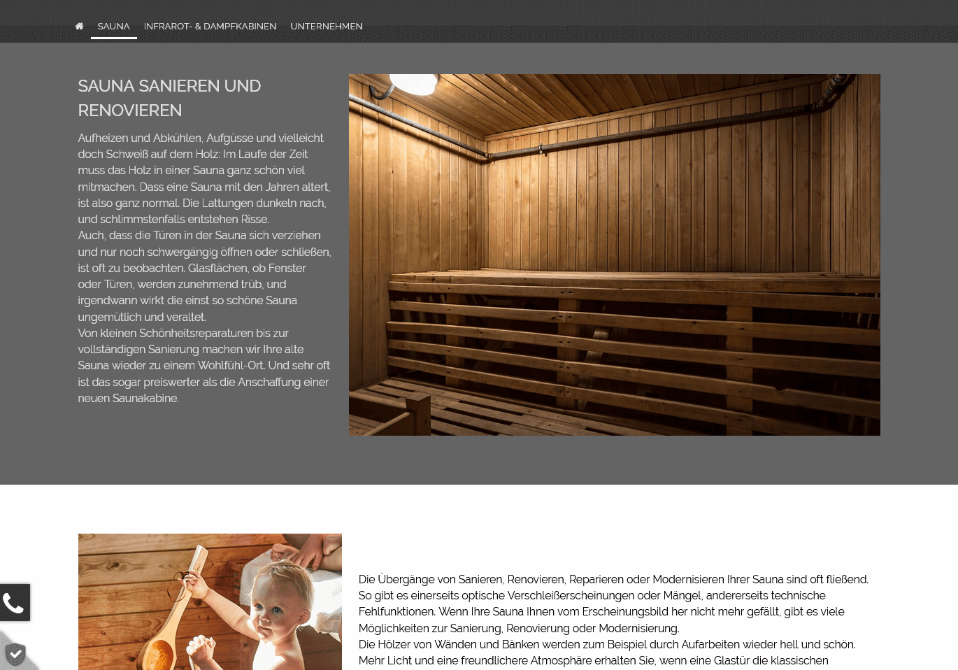 Ziel war eine sachliche Webseite mit großformatigen Bildern, die einen Eindruck der verschiedenen Sauna- und Dampfkabinenlösungen vermittelt und gleichzeitig ausführliche Informationen zu den angebotenen Leistungen bereitstellt.