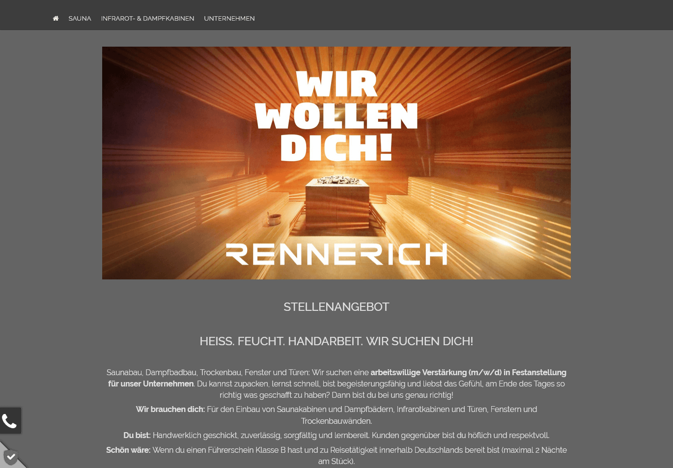 Für die Rennerich UG aus Schloß Holte-Stukenbrock entstand ein neuer Internetauftritt für ein Unternehmen im Bereich Sauna- und Dampfkabinenbau. Da zuvor keine eigene Webseite vorhanden war, sollte ein moderner und klar strukturierter Webauftritt entwickelt werden, der Leistungen und Produkte übersichtlich präsentiert.