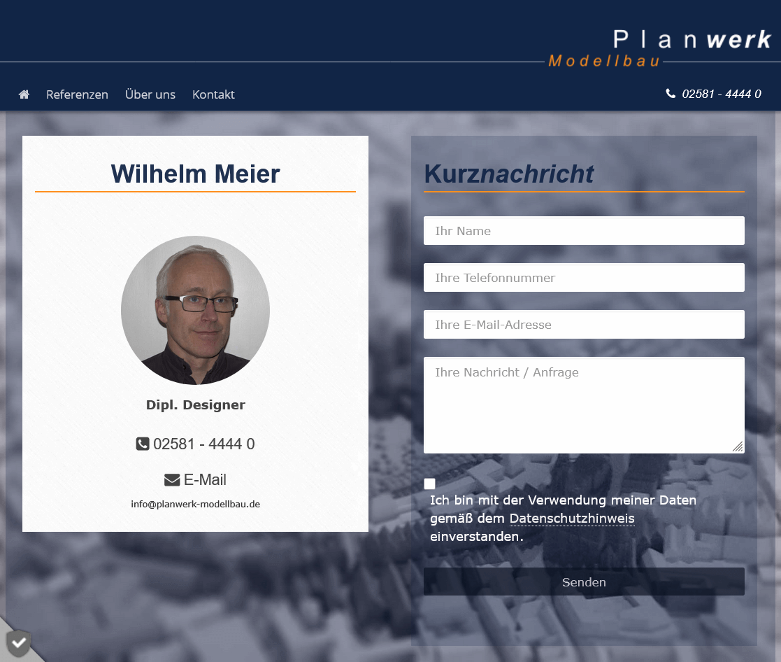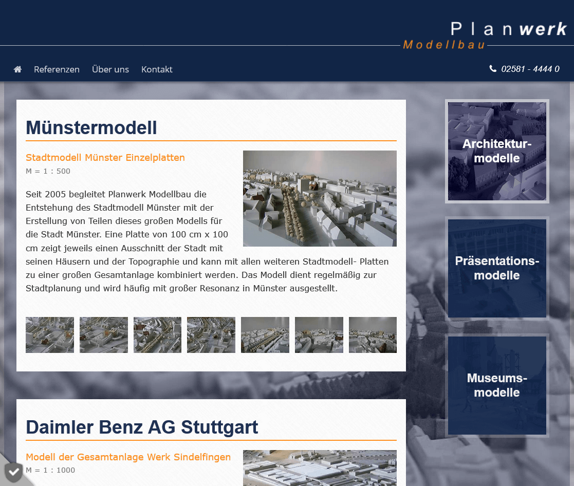 Für Planwerk Modellbau aus Warendorf wurde eine neue Webseite entwickelt, die die hochwertigen Modellbauarbeiten des Unternehmens klar und bildstark präsentiert. Ziel war es, die verschiedenen Modellarten übersichtlich darzustellen und den Fokus auf Referenzen und Projektbeispiele zu legen.